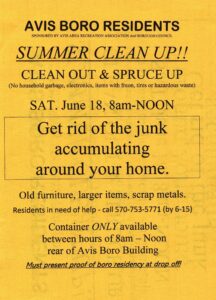 Clean out & Spruce up! Saturday, June 18: 8am – Noon. Bring your larger items to the rear of the Borough building: old furniture, larger